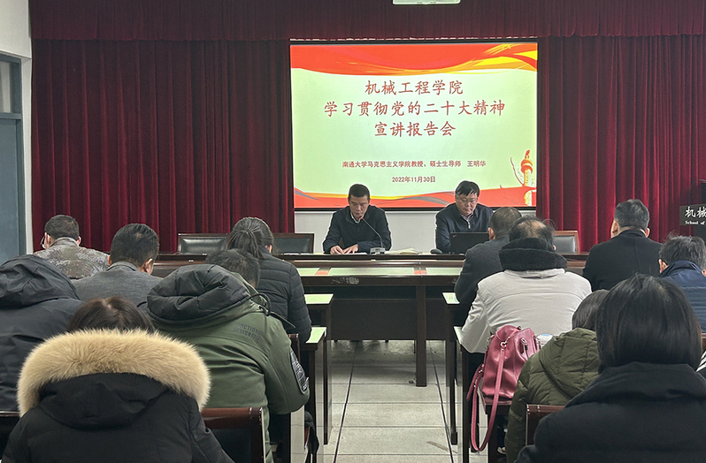 为深入学习贯彻党的二十大精神,引导全体教职工学思践悟新思想、砥砺奋进新征程,11月30日下午,机械工程学院党委召开党的二十大精神宣讲报告会。马克思主义学院教授、硕士生导师,南通市委理论宣讲团成员王明华应邀作宣讲报告。