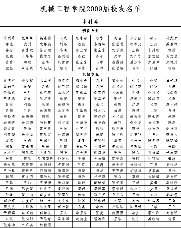 机械工程学院2009届校友名单