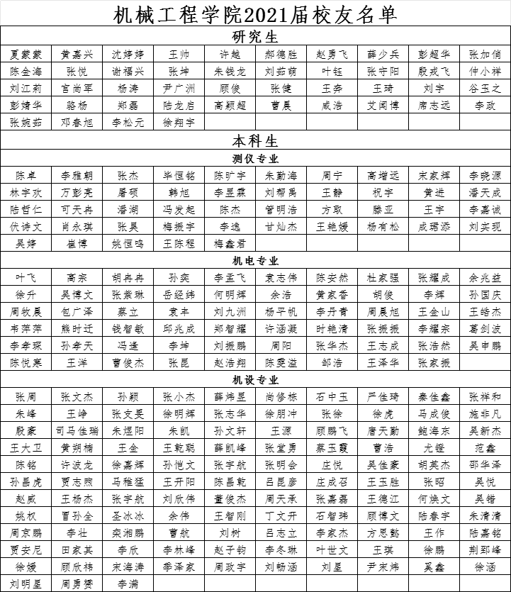 机械工程学院2021届校友名单