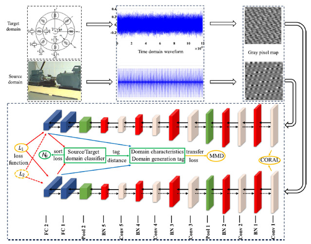 针对目前滚动轴承故障诊断的源域数据多来自于实验室,在迁移学习过程中难以获取实际故障样本,网络训练方式落后,没有充分发挥损失函数的优点等不足,该文提出了一种基于动力学机理仿真联合改进交替迁移学习的滚动轴承故障诊断新方法。通过对滚动轴承动力学方程进行修正,构建不同故障状态的动力学仿真模型,获取大量故障标签信息的源域数据集;提出了一种改进的交替迁移学习算法,通过在不同层交替计算损失函数,缩小不同域之间的距离,完成网络参数交替更新,实现不同损失函数的优势互补。试验结果表明,该方法有效地减少了滚动轴承不同领域数据之间的特征分布差异,具有较高的诊断精度,为轴承机械故障早期诊断提供了新的思路。