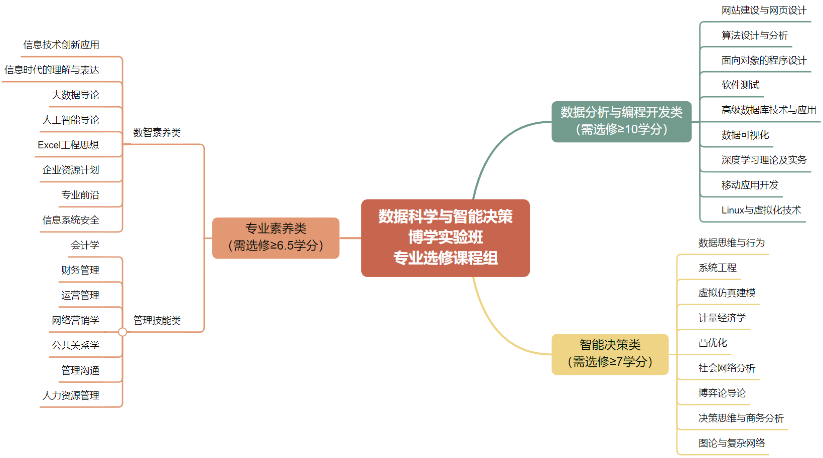 l 专业选修课(33 门):特设“数据分析与编程开发类”、“智能决策类”、“专业素养类”三类专业教育选修课程组,全覆盖数据科学与大数据技术专业、计算机科学与技术专业的主干课程,并聚焦培养管理实践中的问题解决能力设置了智能决策类课程,学生可根据个人兴趣灵活选修,满足不同方向培养需求。