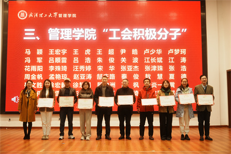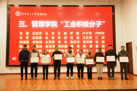 会上,嵇蕴洁副院长宣读了《关于颁发管理学院2023-2024年度“优秀工会集体”“优秀工会干部”“工会积极分子”奖的表彰决定》,表彰学院在过去一年中涌现出的优秀集体和个人,激励和动员广大教职员工创优争先,全力推动高质量高水平学院建设取得新成效。