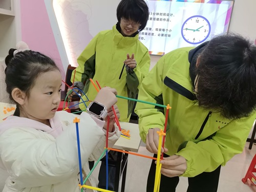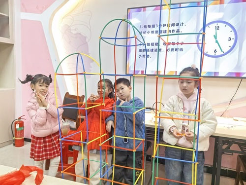 紧接着的“小吸管,搭世界”创意实践环节,孩子们被分为两组,每组领取一套吸管积木。在观看搭建范例后,各组迅速投入讨论与设计,在志愿者引导下,将课堂所学的“团队协作”“问题解决”等能力运用到实际操作中。孩子们动手搭建出“友谊桥”“梦想塔”等作品,不仅锻炼了空间思维与动手能力,也在合作中深化了彼此的理解与欣赏。