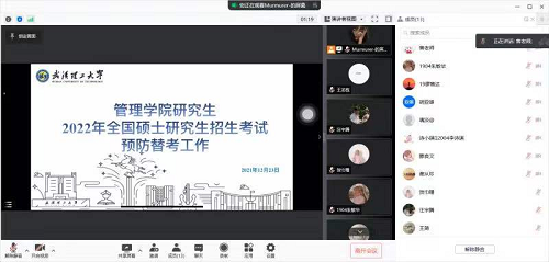 12月23日晚,管理学院辅导员曾珠主持召开了管理学院研究生2022年全国研究生招生考试防替考工作大会的线上会议,各班班长作为代表参加此次会议。曾珠老师带领大家学习了关于防替考的相关资料后,将具体工作安排传达给各位班长。具体工作包括12月24日和25日晚进行全院的查寝工作;12月25日上午9: 00以班级为单位展开腾讯会议点名两项工作。