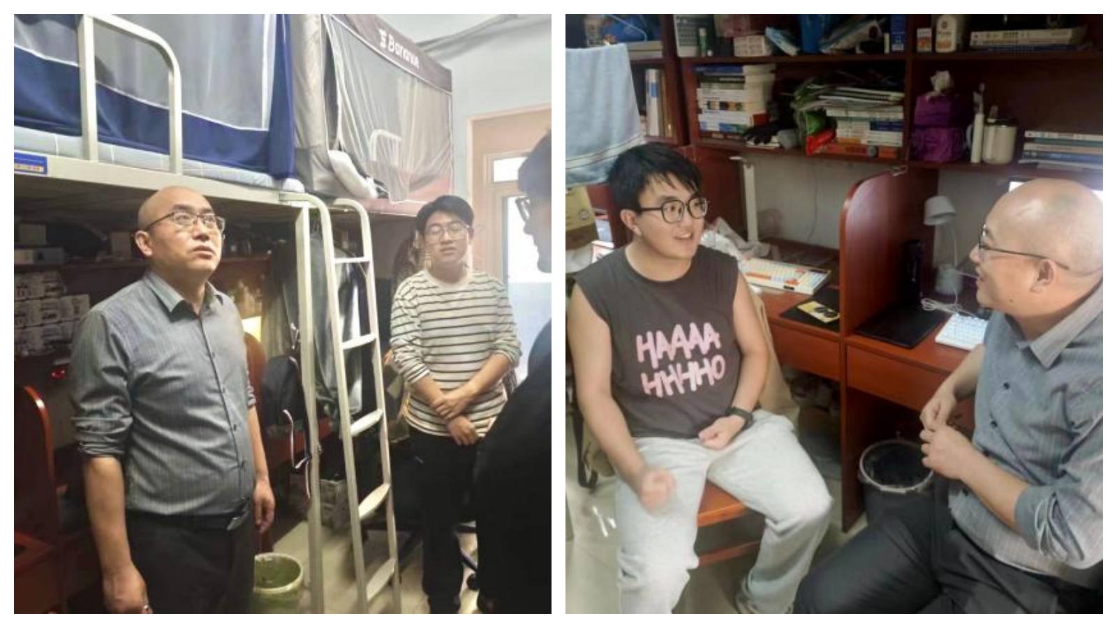 牟老师详细询问学生的宿舍关系、作息习惯与锻炼情况,关心学生们的生活起居与未来打算。交流过程中,牟老师分享了自己的求学过往与宿舍经历,鼓励团队学生在生活上珍惜情谊、在科研时默契协作、在发展中互促互进。根据学生的专业方向,牟老师在宿舍现场开展学术指导,鼓励学生优化学科知识结构、提升科研创新精神、涵养良好科研道德,结合专业前沿与社会所需,做真正有意义的科研。导学团队师生围坐一起,在轻松和谐的氛围中收获知识、共话成长。