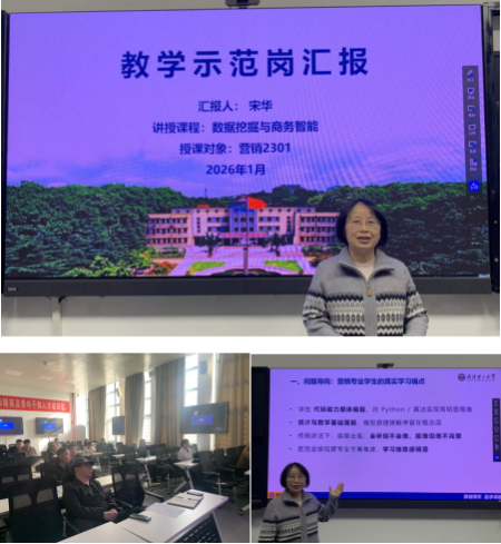 展示环节中,宋华老师围绕本学期面向营销专业数字营销方向开设的《数据挖掘与商务智能》课程教学实践进行了专题汇报。针对营销专业学生代码能力和统计基础相对薄弱的实际情况,课程以项目驱动为主线,引入大语言模型开展系统化辅助教学,通过形象化方式讲解抽象理论,引导学生完整经历数据挖掘项目流程,有效提升了学生对课程内容的理解深度、项目完成质量和学习信心。